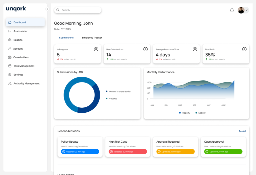Streamline the entire underwriting workflow and rapidly adapt to your unique business needs, accelerating time-to-value 5x with Unqork’s AI-enabled, ready-to-implement workbench