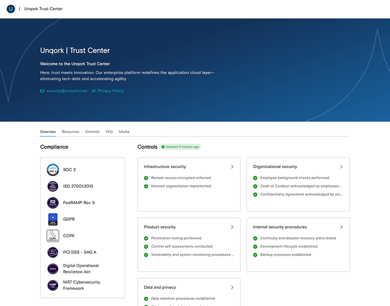 Unqork’s enterprise platform is designed with security at its core. Unqork Trust Center provides centralized access to our security, compliance, and privacy information, showcasing our commitment to data protection and best practices.